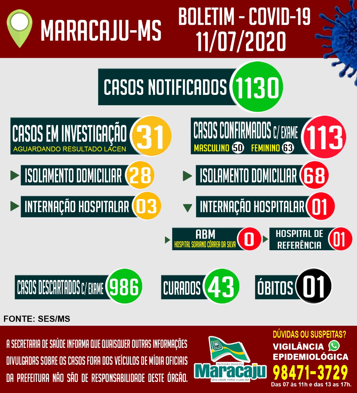 No início da noite desta sábado 11-07 a Secretaria Municipal de Saúde, através da Coordenação de Vigilância Epidemiológica emitiu comunicado público informando os novos números atualizados do COVID-19 no município de Maracaju, cidade distante a 160 quilômetros de Campo Grande.
