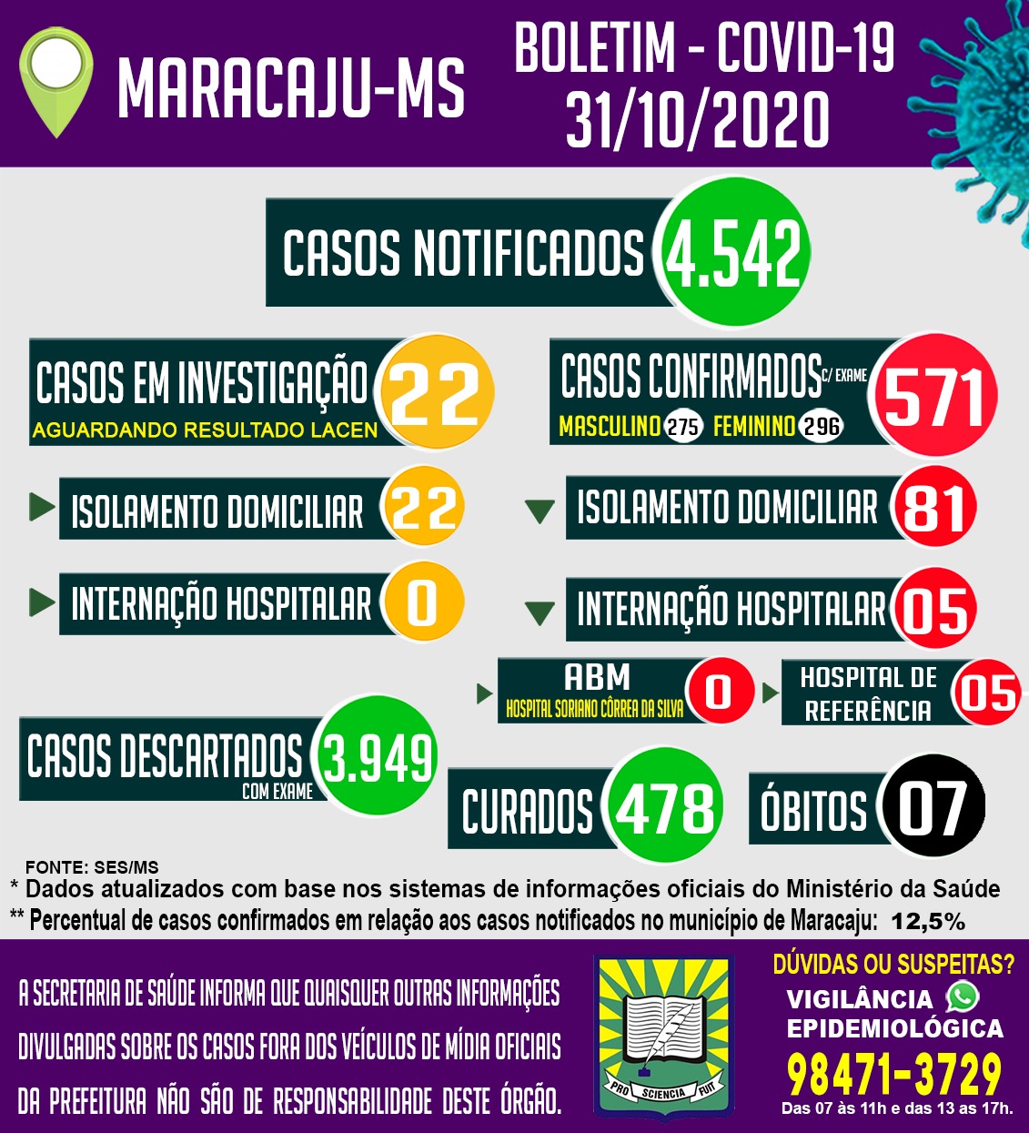 No início da noite deste sábado 31-10 a Secretaria Municipal de Saúde, através da Vigilância Epidemiológica divulgou o Boletim Epidemiológico do COVID-19 em Maracaju, cidade distante a 160 quilômetros de Campo Grande.