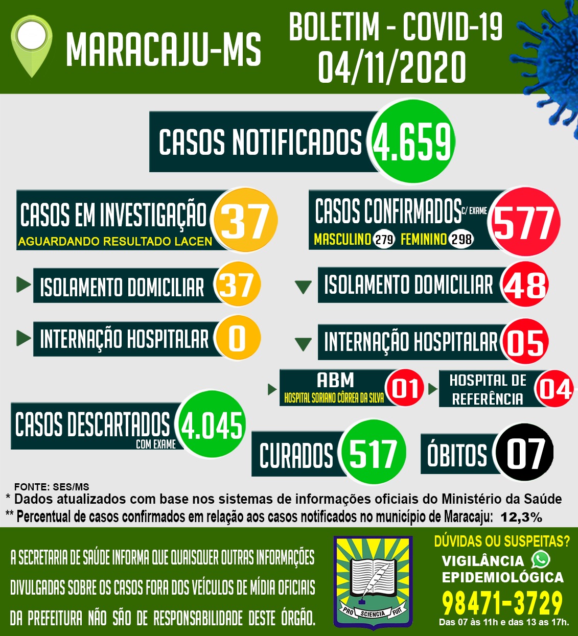 Na última divulgação na data de ontem 03-10, Maracaju contava com 574 casos confirmados totais, segundo a Secretaria Municipal de Saúde.