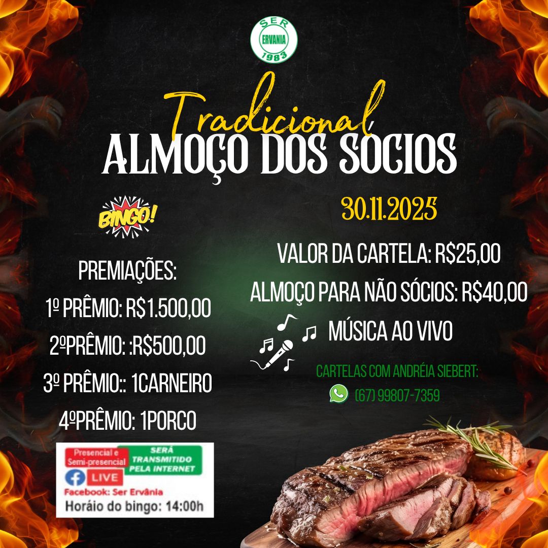 A Sociedade Esportiva Recreativa Ervania promove, no dia 30 de novembro de 2025, mais uma edição do já consagrado tradicional Almoço dos Sócios, reunindo associados, familiares e amigos para um dia de integração, lazer e celebração.